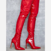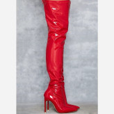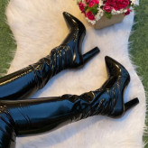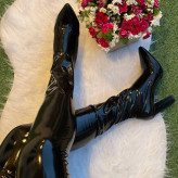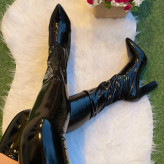 بوت جورابی چرم وورنی قرمز ومشکی داراری دوپاشنه میخی وپهن ده سانتی