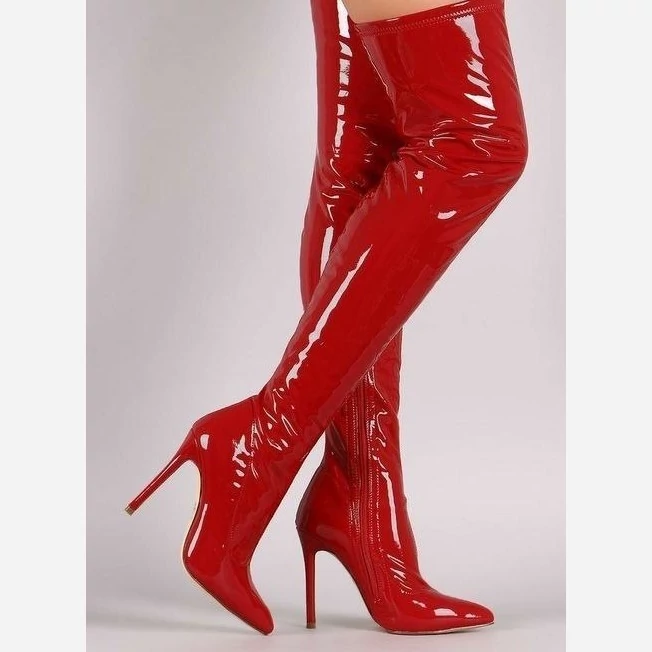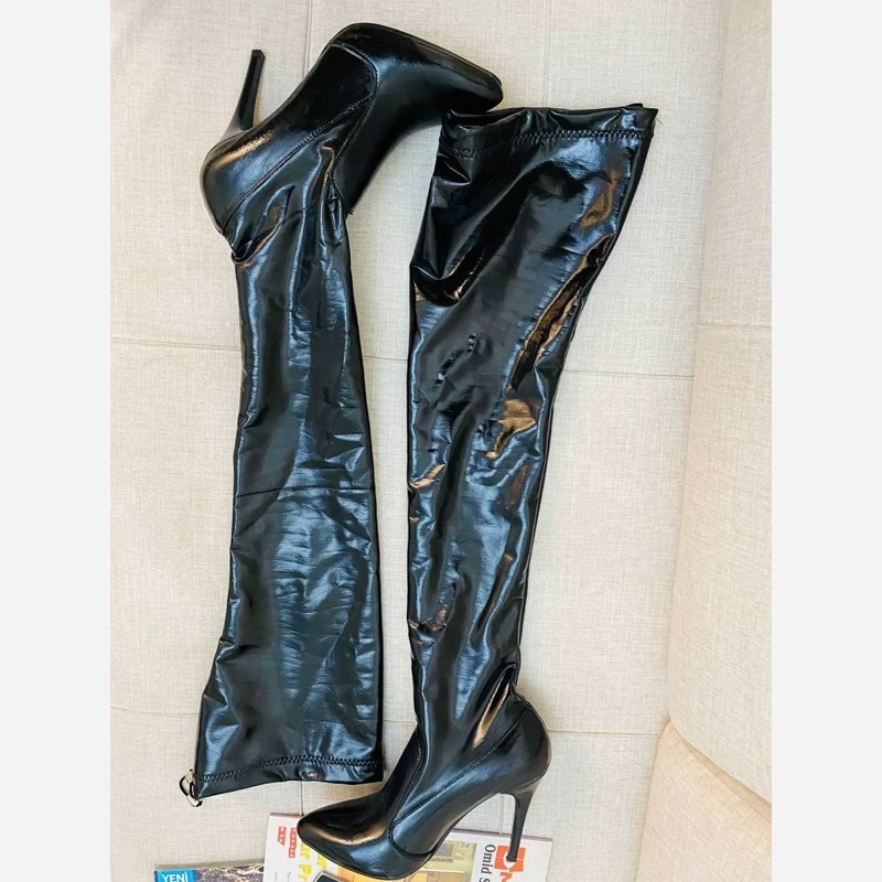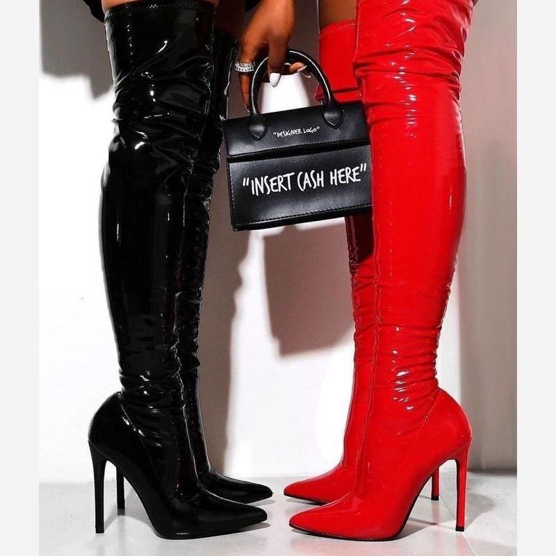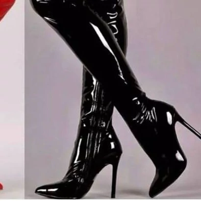 بوت جورابی چرم وورنی قرمز ومشکی داراری دوپاشنه میخی وپهن ده سانتی