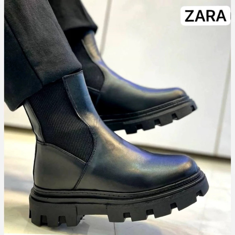 بوت دو طرف کش (کبریتی) زارا چرم ماکرو طبیعی ضد تَرَک و پوسته شدن زیره تی پی یو فنر دار طبی اصل آستر سوئیت طبیعی ضد بو و تعریق کفی طبی ساتل با روکش چرم طبیعی دور دوخت شرکتی و پرس پی یو سایز 40 تا 44